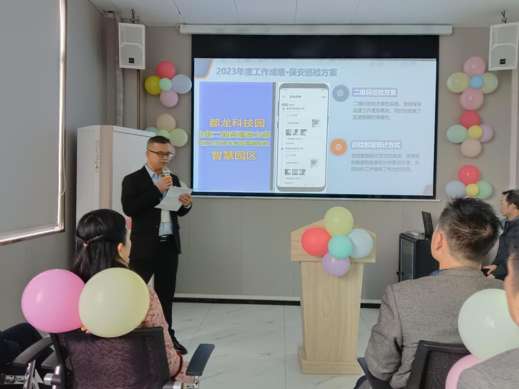 广西都龙科技集团有限公司旗下都龙科技园离不开广西都龙物业管理有限公司(简称:都龙物业)的管理,由物业部黄经理对都龙物业2023年的智慧成果及2024年的智慧计划做演讲。